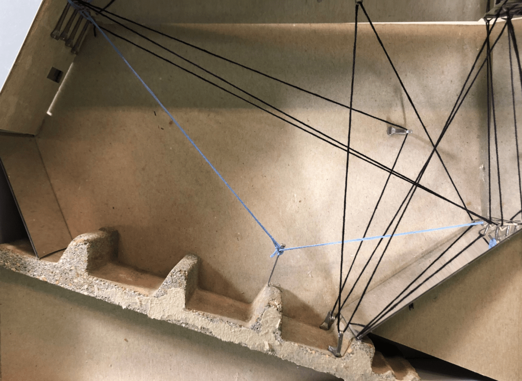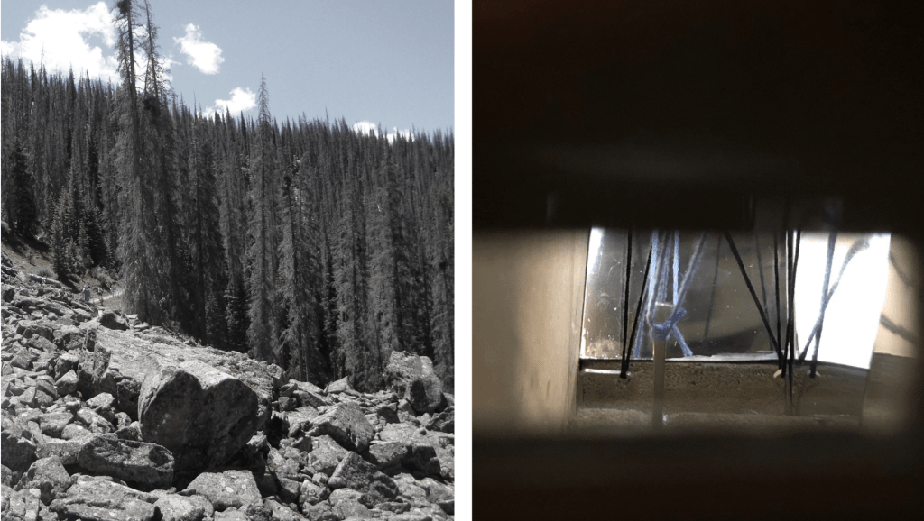 This box contains the memory of hiking in Colorado. Not only was there a sense of awe but also a freshness and calmness as dry air swept through the large coniferous trees. This memory is contained in the box using manipulated nails, concrete, string, and reflected surfaces.