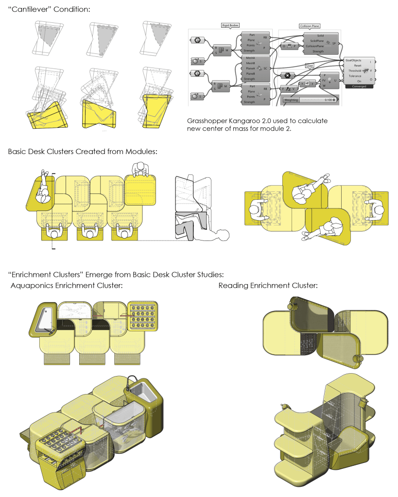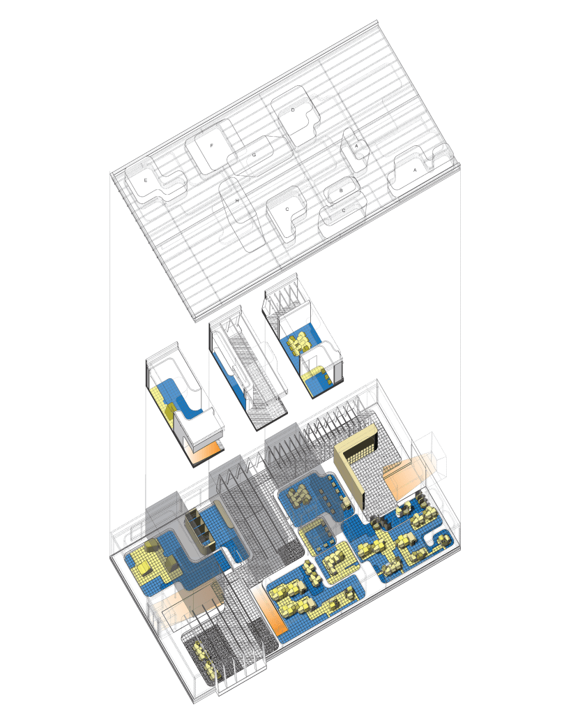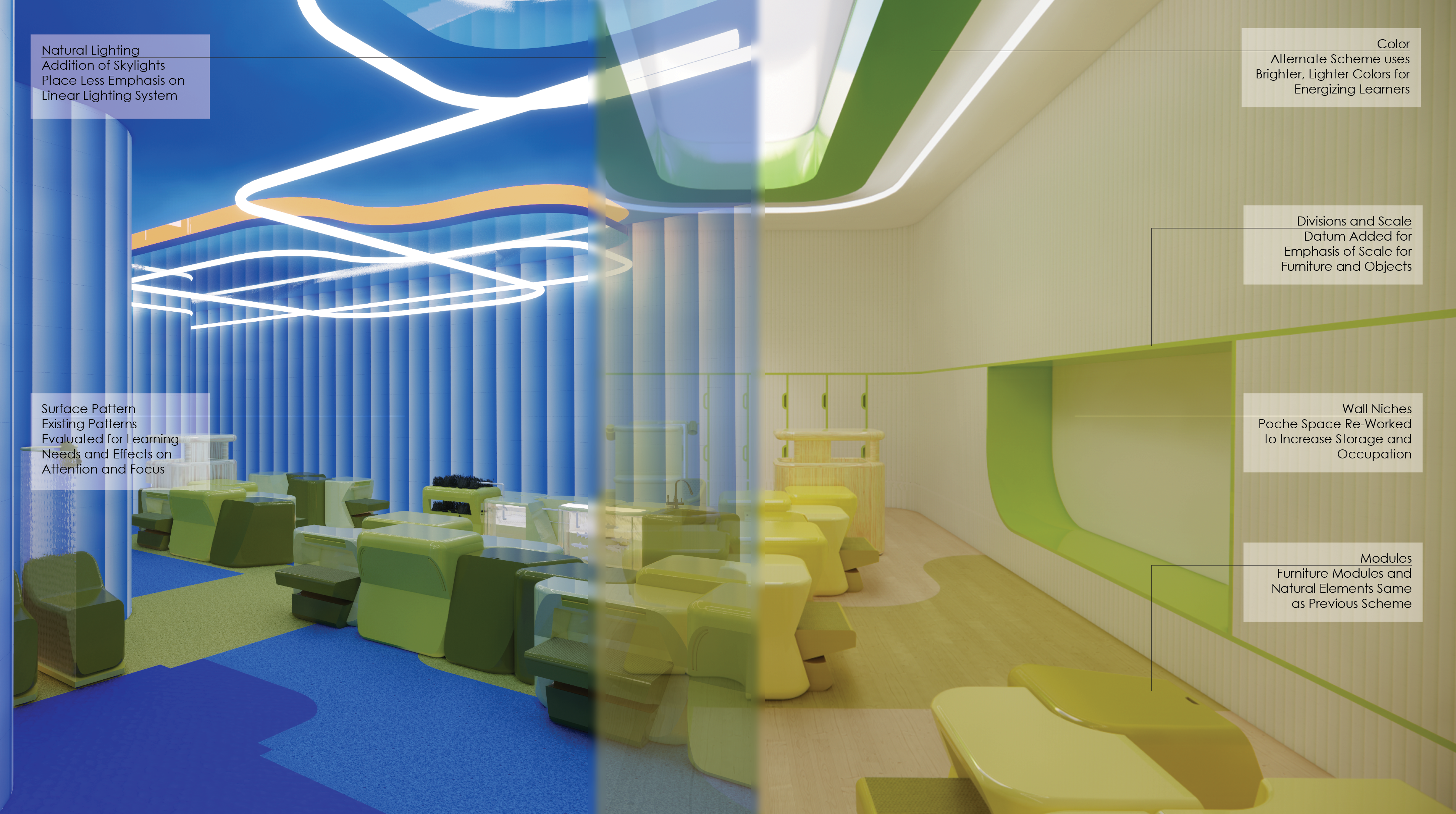 This project intends to re-imagine early childhood learning with a focus on hands-on and self-directed learning styles. Using a “multi-scale” approach, development began with considering the spatial, ergonomic, and learning needs of a kindergartner through furniture and furniture clustering. These principals and forms are then “scaled up” to the development of the rooms, adjacencies, and building intervention. As a result, two distinct spaces are defined: one vibrant and programmed learning space and one un-programmed and flexible learning space showing natural material finishes. Through these strategies, the project aims to give a dynamic space of flexibility and exploration that only hopes to keep up with the child’s growing imagination.