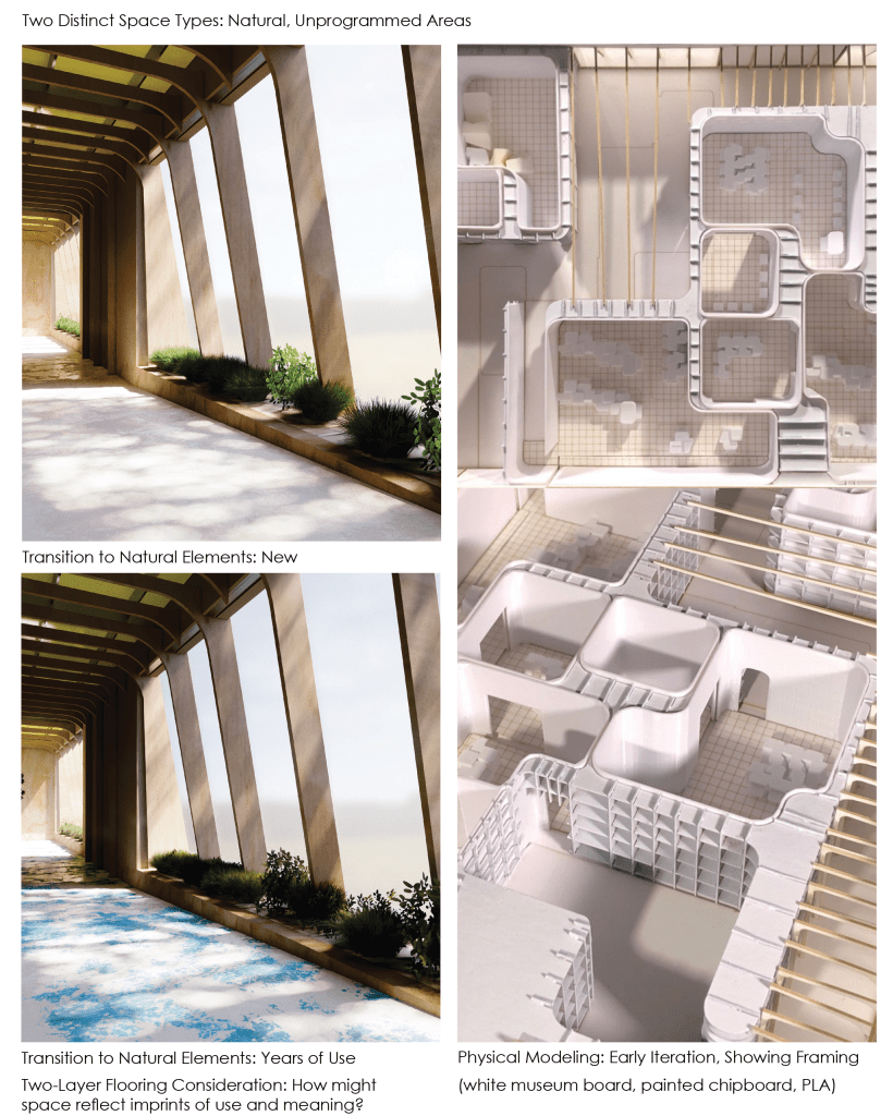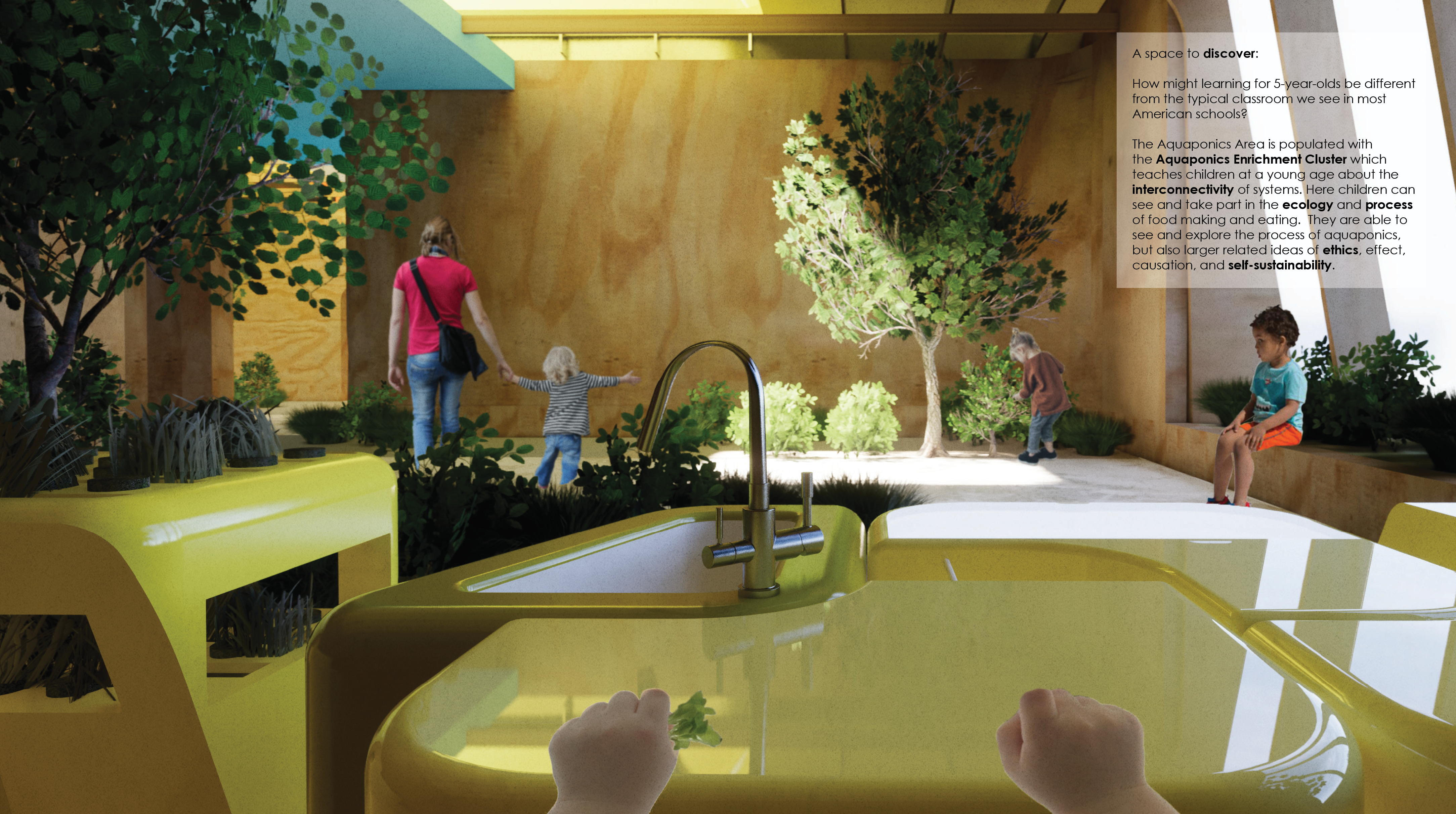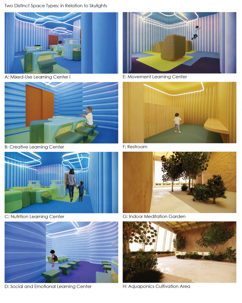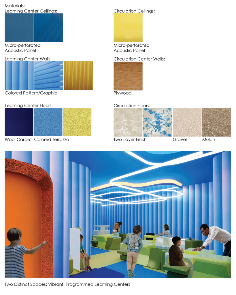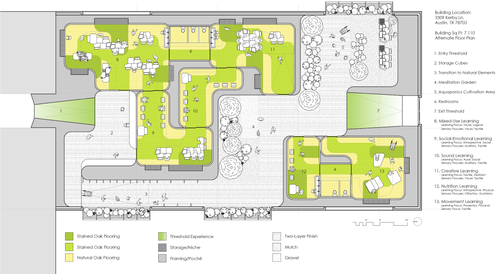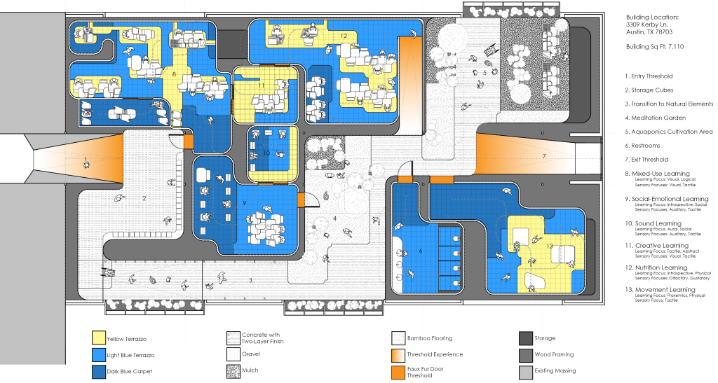 As the world is rapidly changing, it becomes more apparent in-person classroom models have remained virtually the same. Using one wing of Bryker Woods Elementary School, this project was to consider the principals of Fredric Froebel and other hands-on learning pedagogies to create a space for 5-year-olds that break the current conventions of the standard in-person kindergarten classroom.