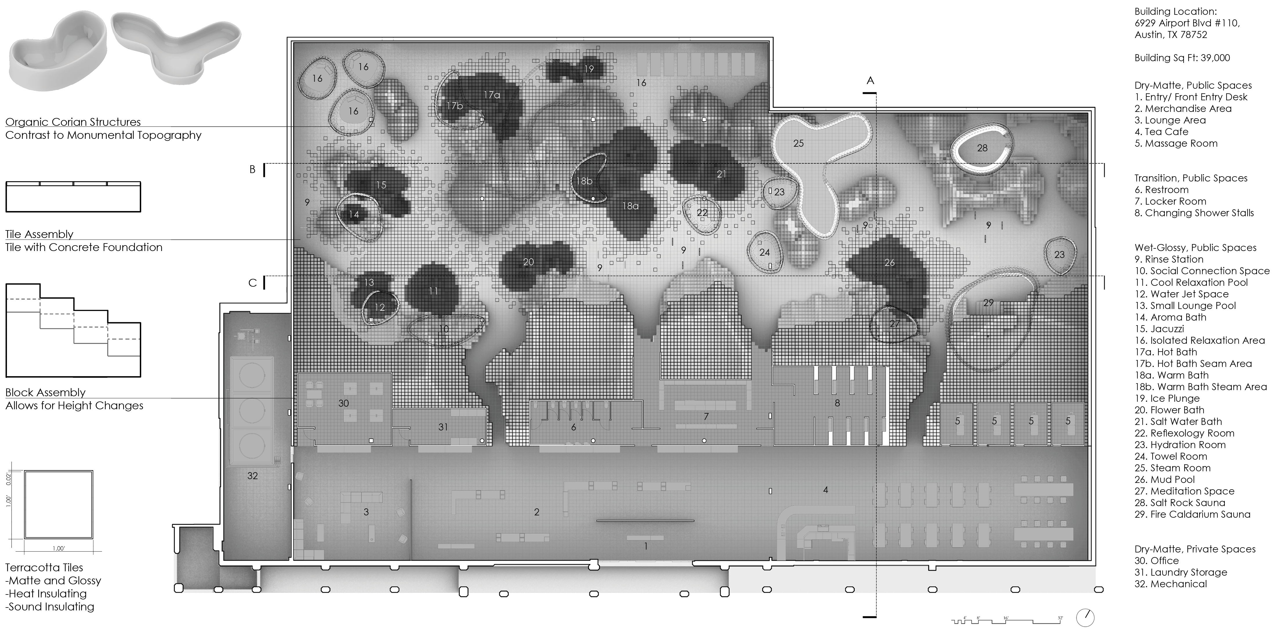 This project seeks to explore the nature of these hearty ecosystems specifically through the exploration of the Numi tile, by Konstantin Grcic, which inspired the development of an undulating gridded topography that separates and filters the user into the unknown and completely interior areas of the bath house itself. The second system of organic Corian structures hangs above the topography which defines more organic and ergonomic spaces of occupation.