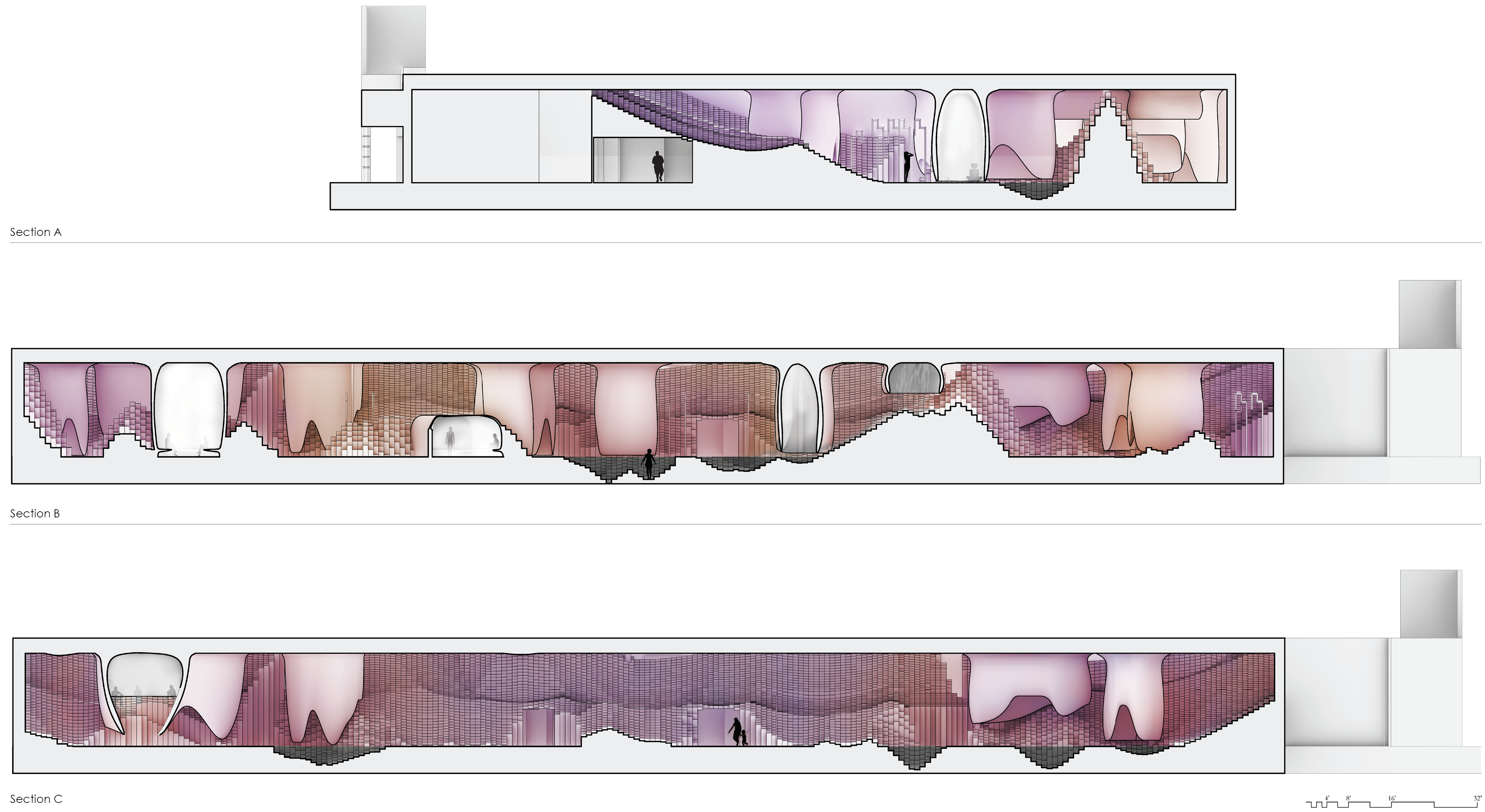 With varying degrees of matte and glossy surfaces, use of a light wall, and the embracing of steam and water elements, the project intends to create a unique and almost volcanic, otherworldly experience.