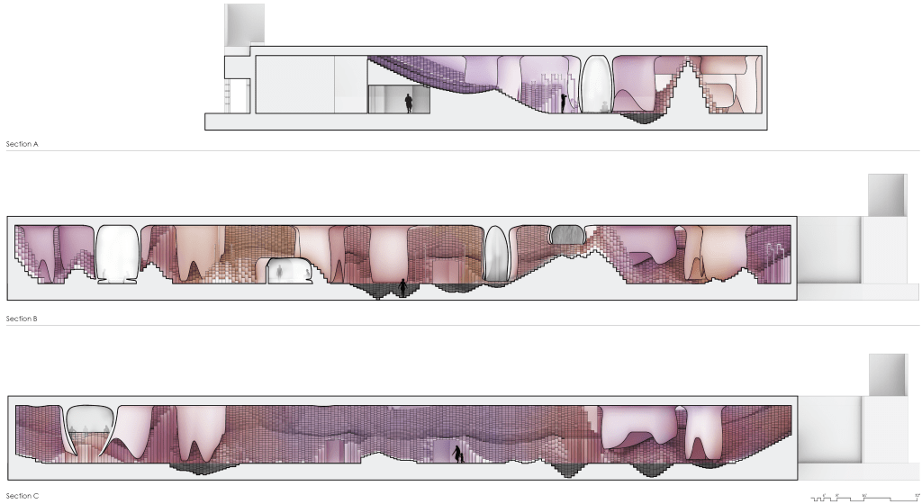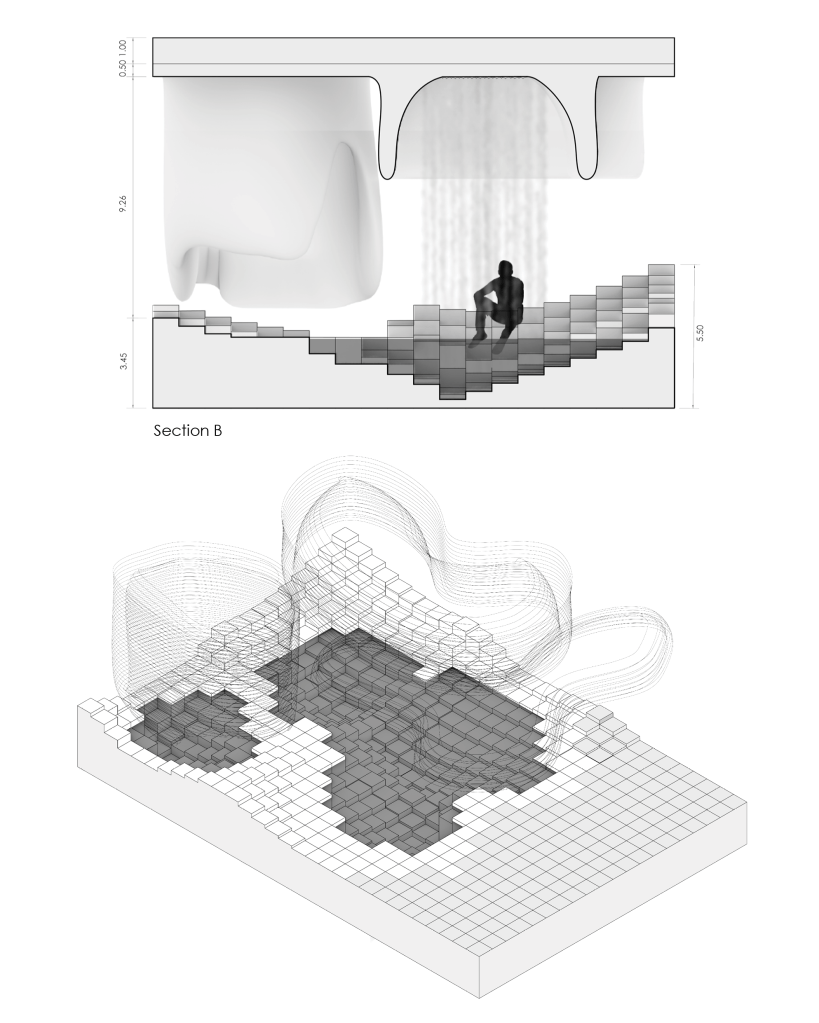 This project seeks to explore the nature of these hearty ecosystems specifically through the exploration of the Numi tile, by Konstantin Grcic, which inspired the development of an undulating gridded topography that separates and filters the user into the unknown and completely interior areas of the bath house itself. The second system of organic Corian structures hangs above the topography which defines more organic and ergonomic spaces of occupation.