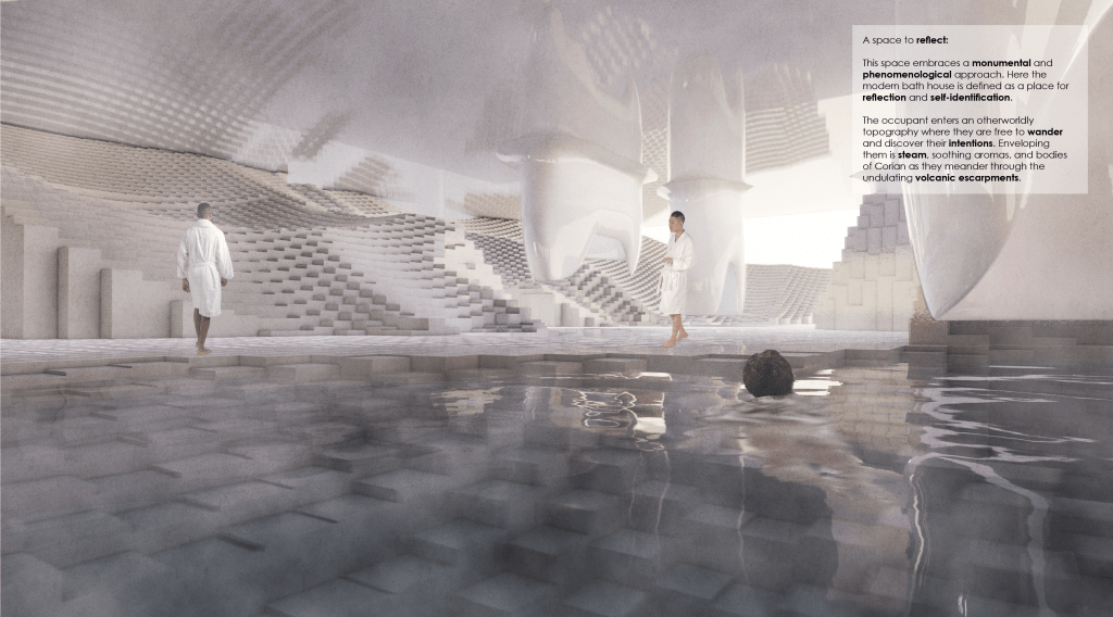 With varying degrees of matte and glossy surfaces, use of a light wall, and the embracing of steam and water elements, the project intends to create a unique and almost volcanic, otherworldly experience.