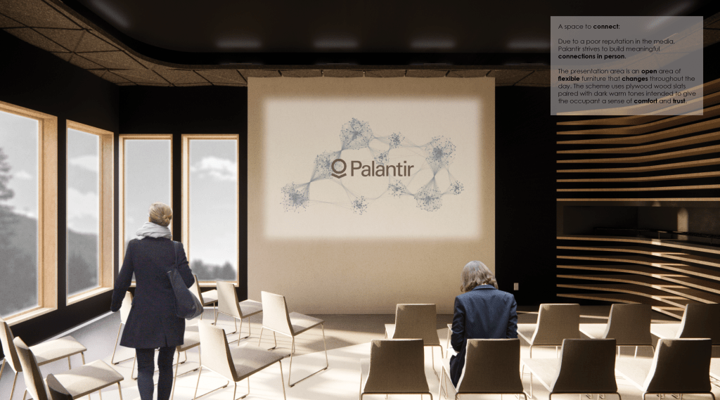 Every year, the World Economic Forum is held in Davos, Switzerland where leaders, advocates, and corporate influencers engage in conversations around broad global concerns. Many of these attendees include technology companies, such as Palantir— an American company that specializes in big data analytics. Their pavilion at the Forum is crucial because they rely on direct client interactions to form a positive reputation and maintain client privacy.