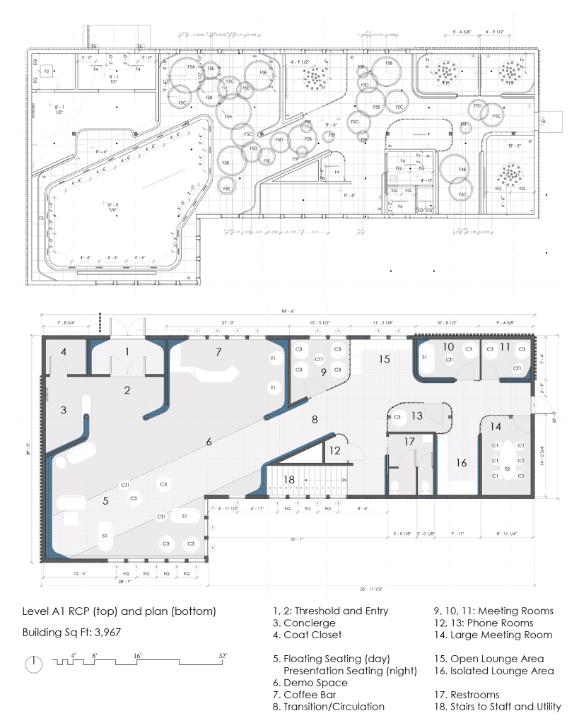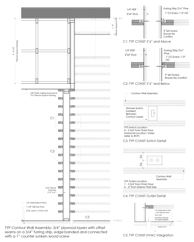 This project aims to provide Palantir with a space that establishes different levels of privacy and personability to harbor the “trilateral connections” that the company strives for. Palantir is also a company that seeks to set the precedent for what technology can do. In a similar manner, a wood wall system of layers and contoured curves is used to organize space, integrate systems and reflect a new and memorable image for Palantir and for technological design typologies.