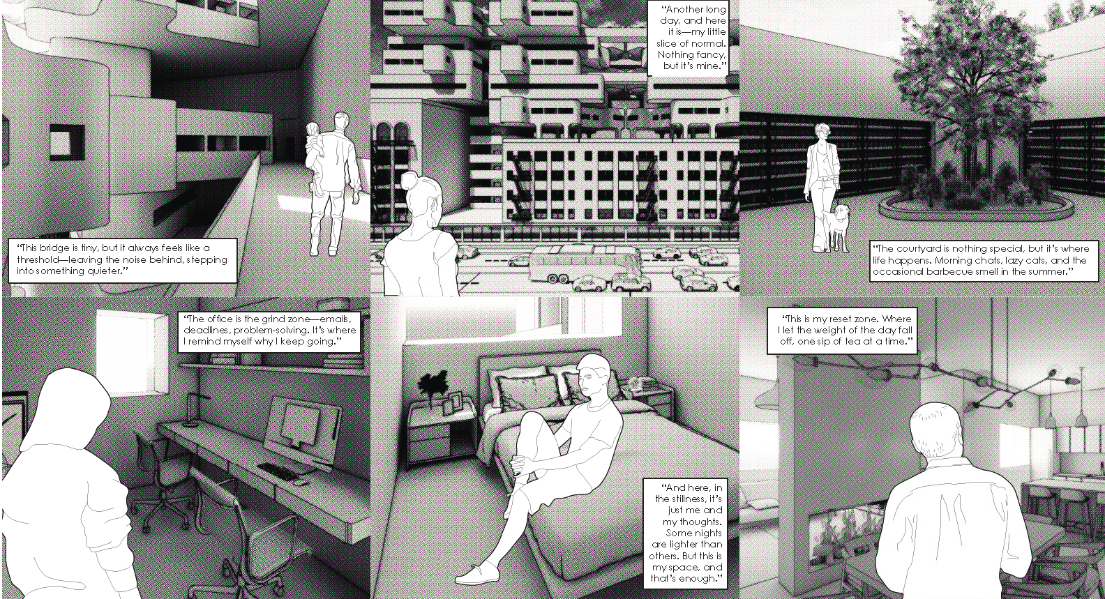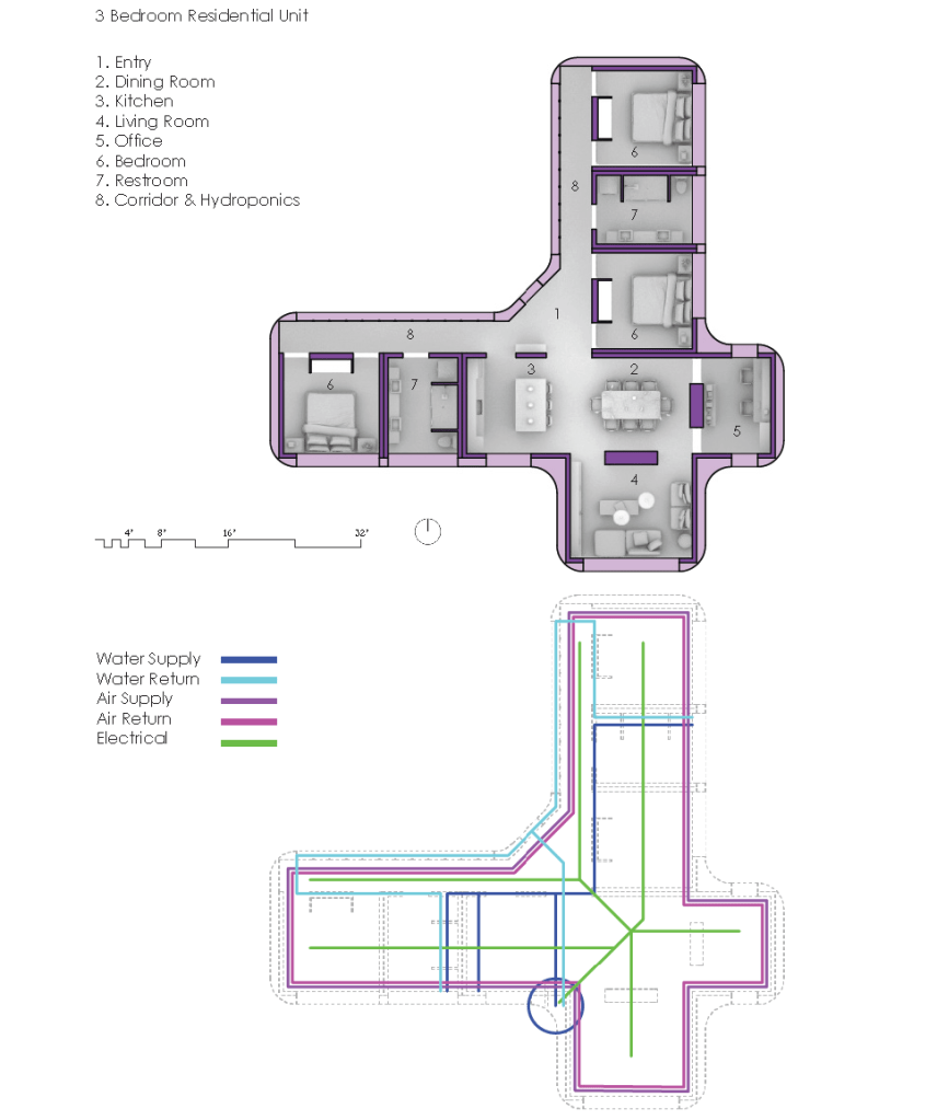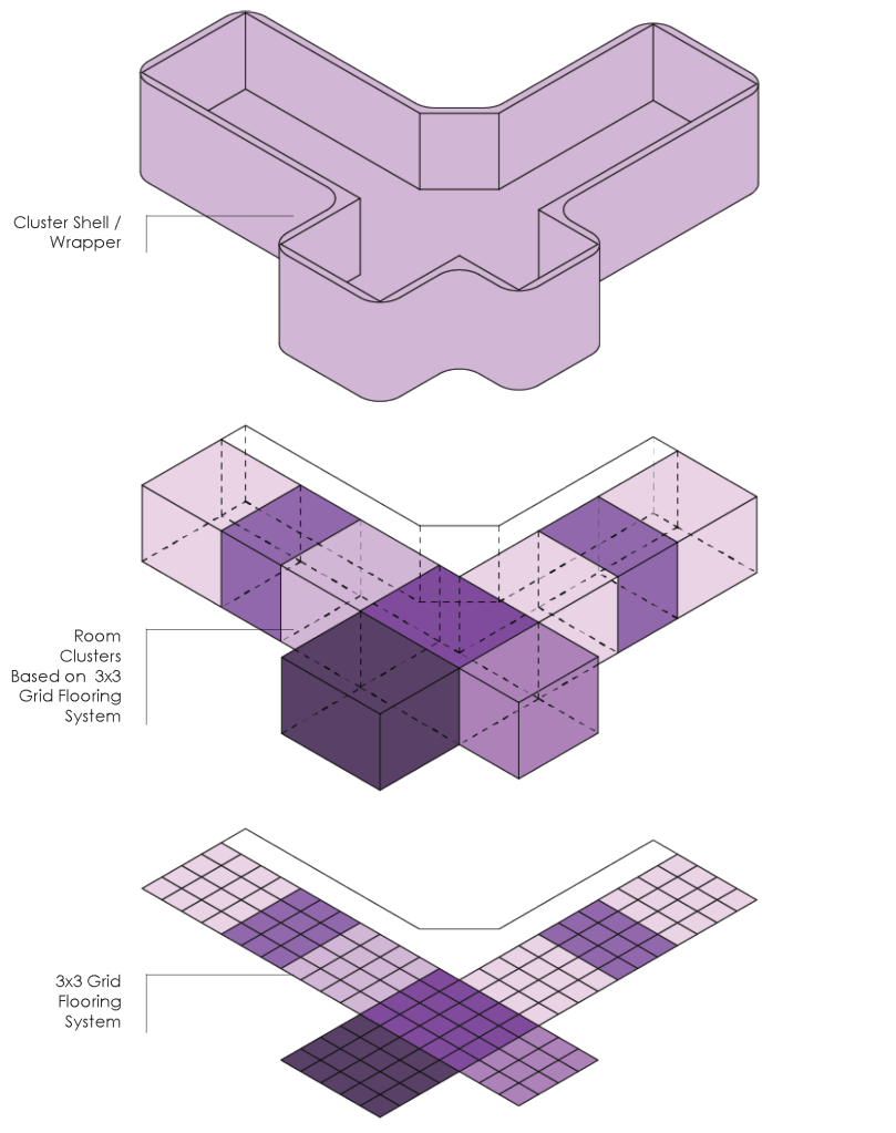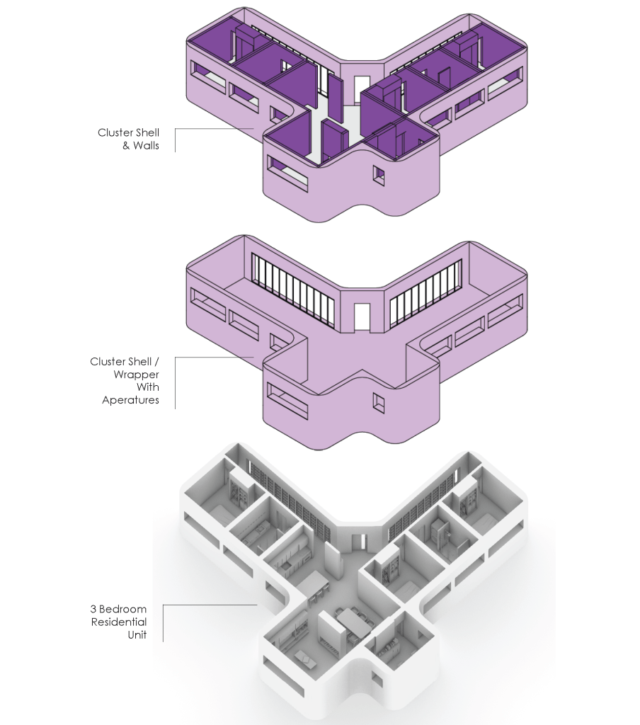 The subject of geography is used to understand “living systems” as layered systems of parts and wholes. Through this understanding of parts to-whole relationships, this project proposes a domestic housing system where space is compressed, and reorganized to facilitate adjacencies for system optimization and sharing.